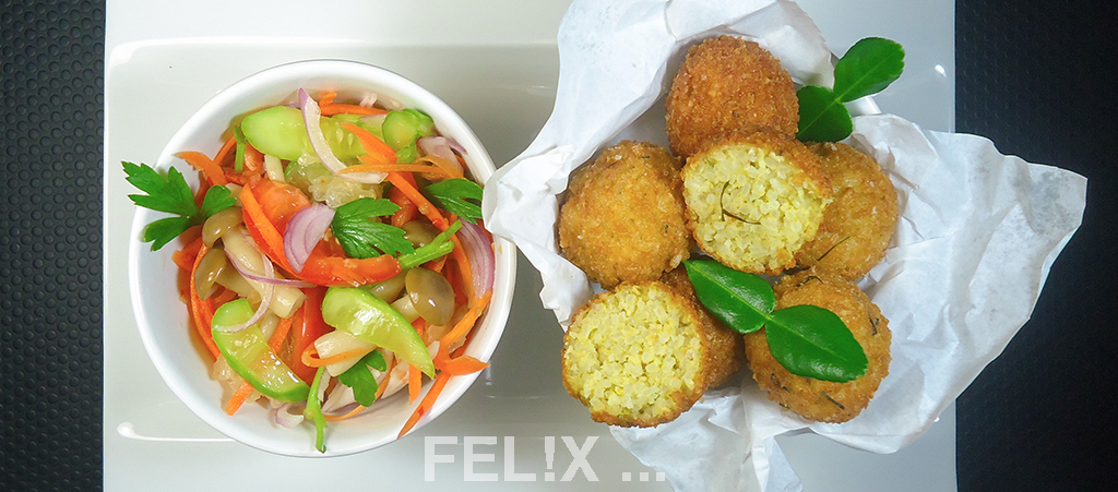 Die Salatzutaten können bereitgestellt, die Reisbällchen fertig frittiert werden, denn diese werden lauwarm oder sogar kalt serviert!