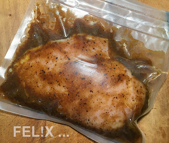 Zusammen mit der Marinade in einem Plastikbeutel vakuumieren (Einstellung «nass» oder Pulse-Funktion).
