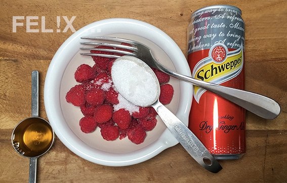 300 g Himbeeren, 3 EL Zucker, 8 cl Bourbon Whiskey, 1 L Ginger Ale, 700 ml Sekt oder Weisswein.