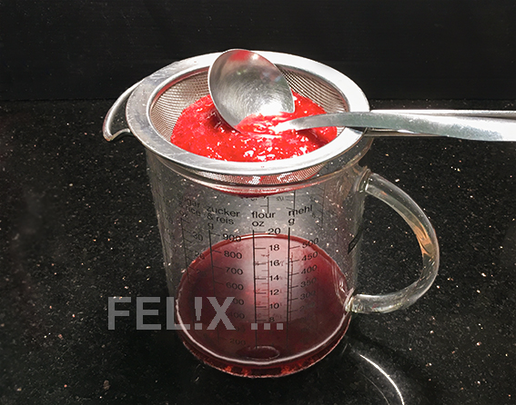 Tipp: an den verbliebenen Himbeerkernen ist noch genügend Aroma, um daraus etwas Himbeeressig zu machen!