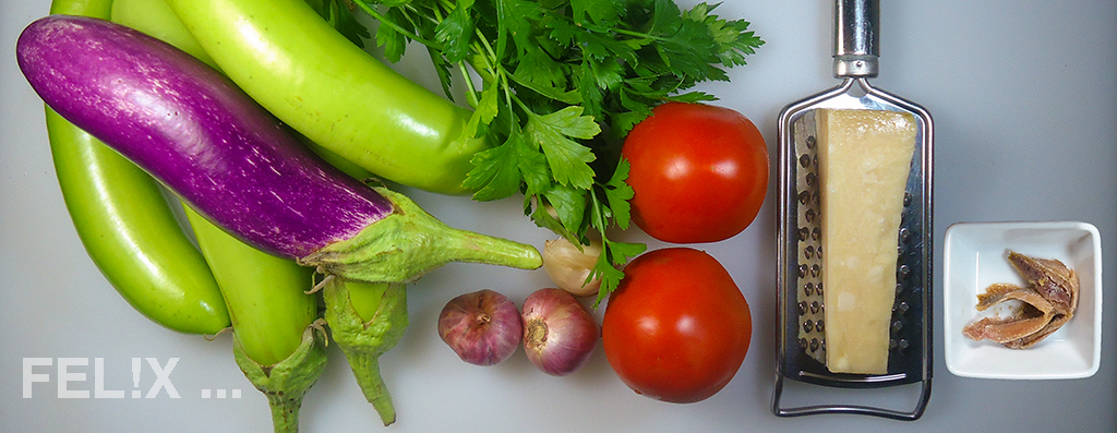 Stufenweise deshalb, weil die Auberginensauce gänzlich vorbereitet werden kann, in der zweiten Stufe werden nochmals Auberginenwürfel gebraten, welche über Pasta mit der Sauce gegeben werden.