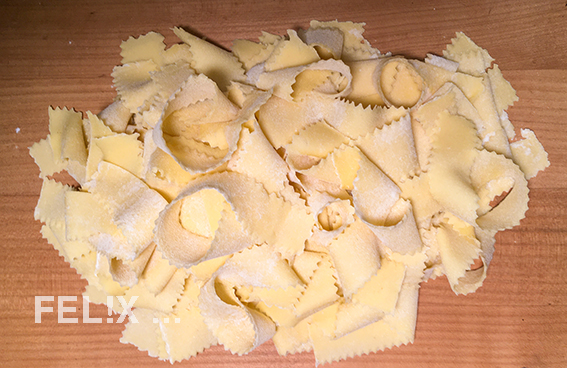 gezackte Pappardelle oder Tagliatelle lassen sich am besten mit einem (gezackten!) Teigrädchen schneiden, wenn der ausgewallte Teig auf einer weichen Silikonmatte liegt.