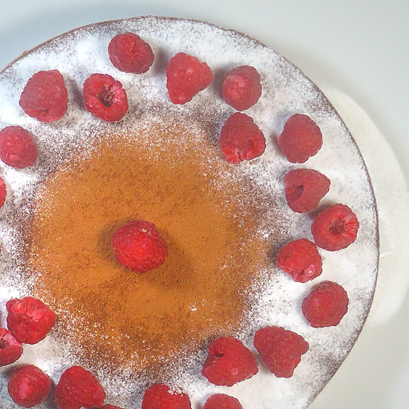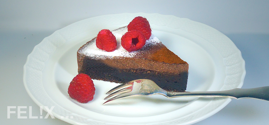 ohne Mehl mit einem Schokoladen-Himbeer-Pudding als Topping.