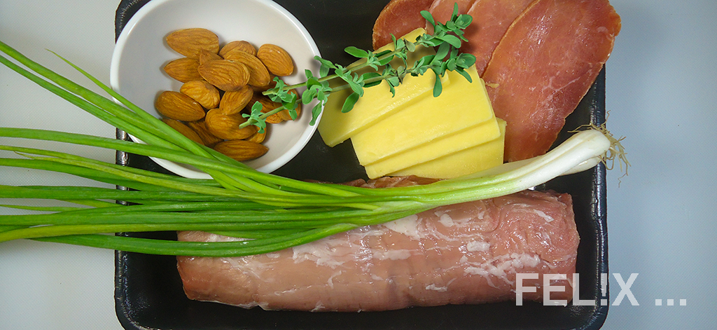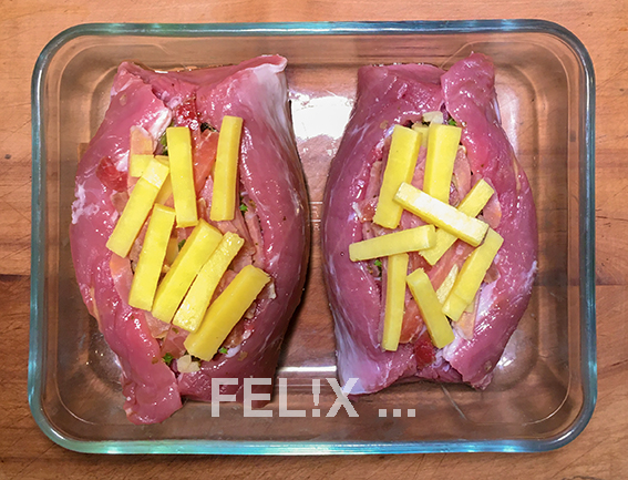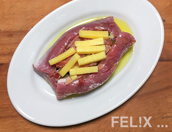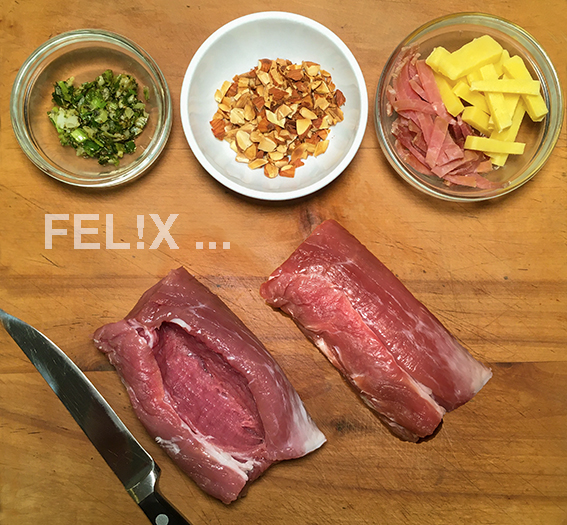 kein Binden, keine Zahnstocher zum Verschliessen! Ins Fleisch wird eine Art Tasche geschnitten, die mit Mandeln, Kräutern, Rohschinken und Käse gefüllt und das offene Filet schliesslich im Ofen gebacken wird.