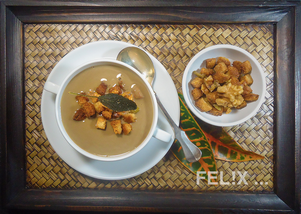 LINSENSÜPPCHEN MIT BAUMNUSS-OLIVEN-CROÛTONS