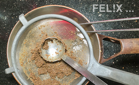 Im Mixer fein pürieren, dann durch ein nicht zu feines Sieb zurück in die Pfanne passieren, was am besten mit der Rundung einer kleinen Schöpfkelle geschieht (= ca. 450 g).