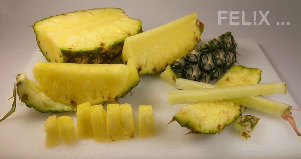 Ananas längs achteln, den Strunk entfernen, schälen, in Scheiben schneiden (= ca. 200 g).