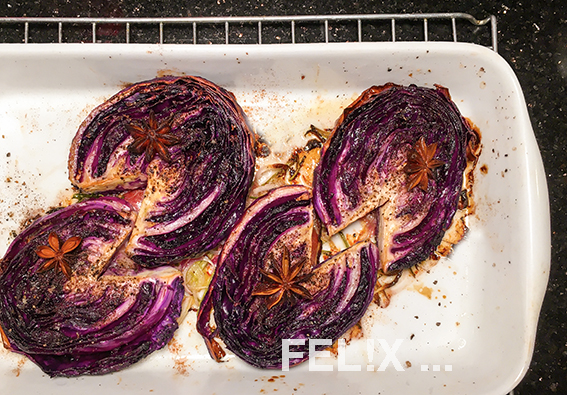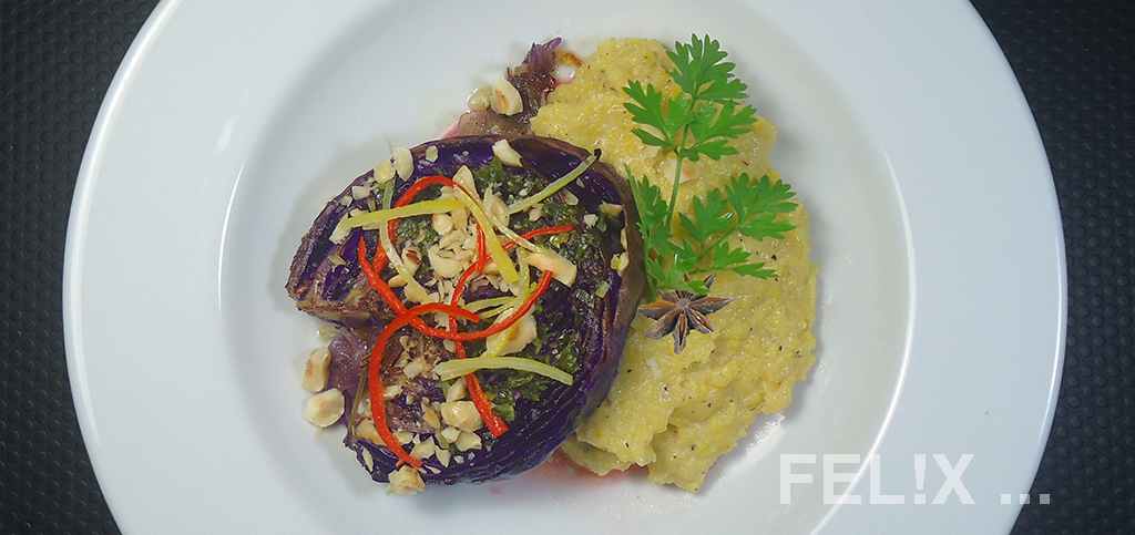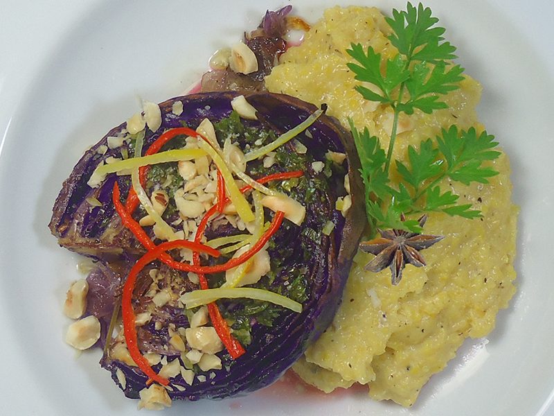 Wir haben diese gebackenen Rotkohl-Scheiben mit Polenta gegessen.