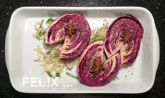 Form mit den Rotkohl-Scheiben im unteren Bereich des Ofens 45–50 Minuten backen.