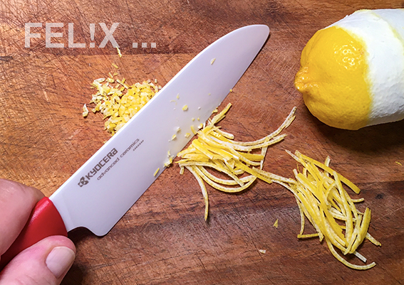 Zitronenschale mit dem Sparschäler fein abziehen, in ca. 5 cm lange Stücke und diese in feine Julienne schneiden.