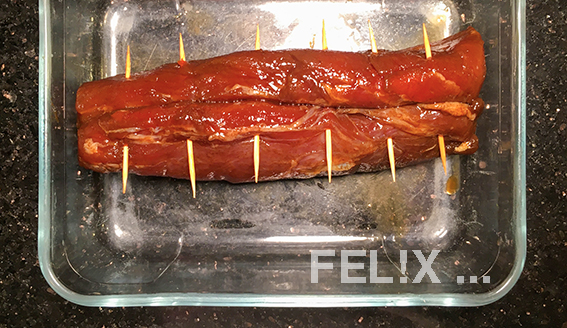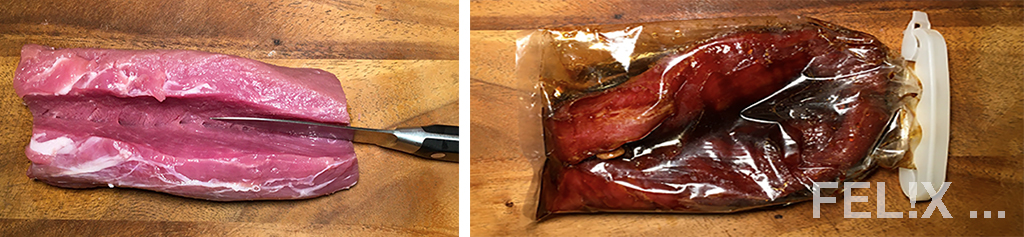 hier in der Marinade für ein Schweinsfilet. Dieses wird längs tief eingeschnitten, so dass möglichst viel Oberfläche zum Aufnehmen der Aromen entsteht.