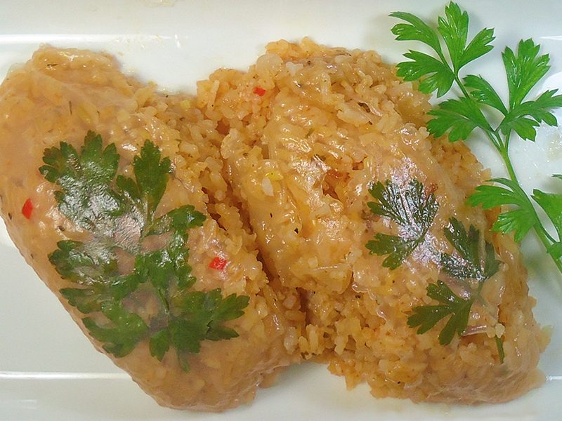 Ich habe dazu Tomatenreis im Reisblatt serviert – lässt sich gut vorbereiten!