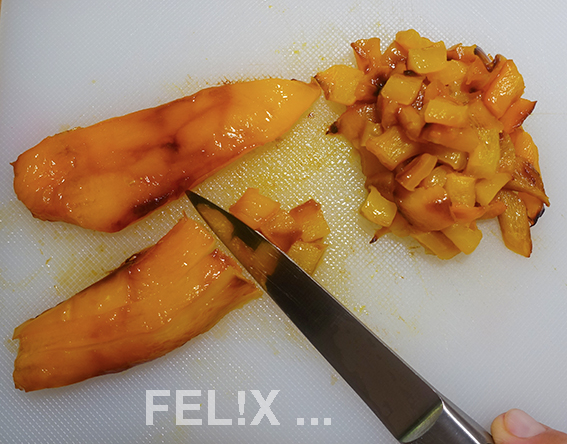 In kleine Würfel schneiden (= ca. 75 g).