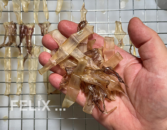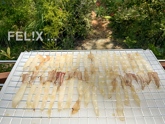 Wer dies trotzdem nicht selber machen will, lässt es eben den Fischhändler tun. In diesem Fall darauf achten, dass auch die Fangarme mit dabei sind. - Ganz ähnlich werden in Thailand auch Streifen von Schweinefleisch mariniert, sonnengetrocknet und frittiert.