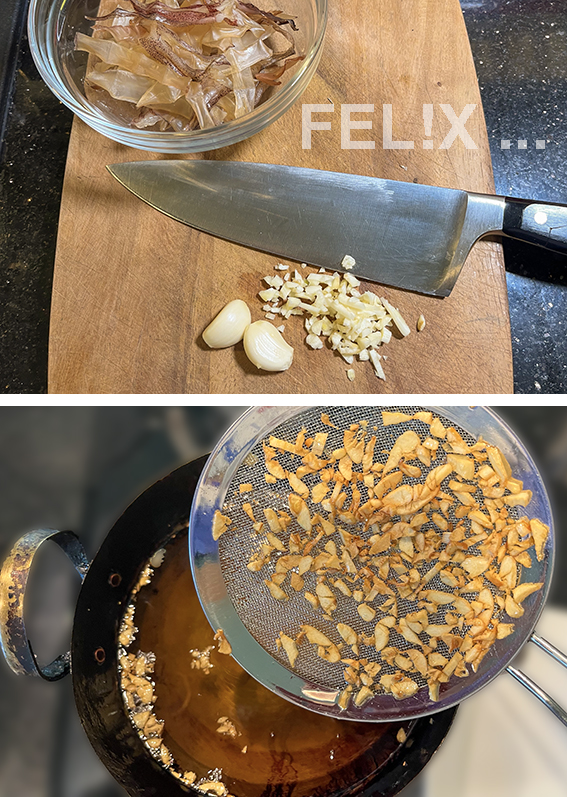 Knoblauch goldbraun frittieren.