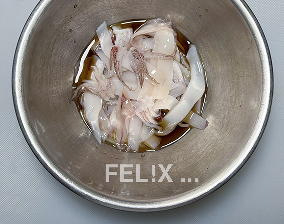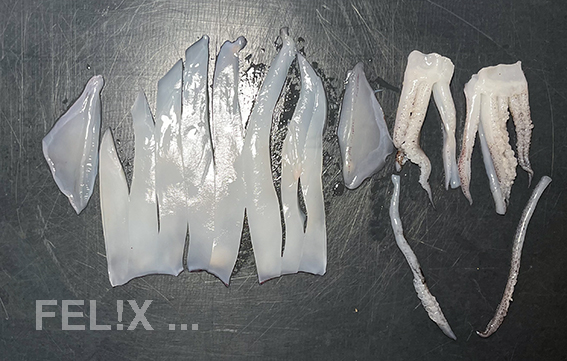 ganze Kalmare wie hier beschrieben vorbereiten, die Mäntel jedoch nicht kreuzweise einschneiden, sondern längs in 3–4 mm breite Streifen schneiden.