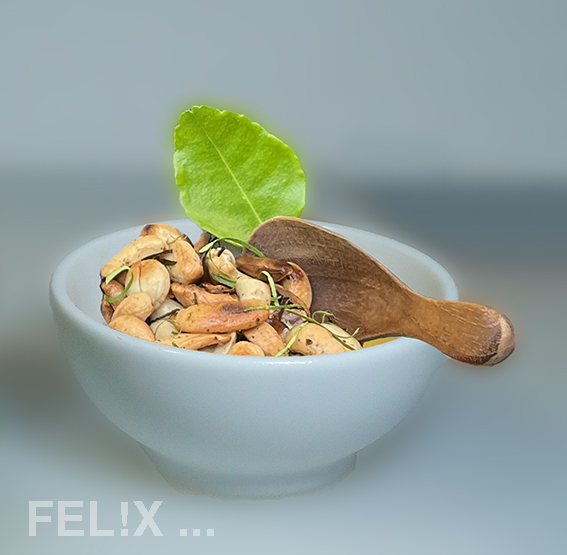 Je 50 g Cashewkerne und Erdnüsse in sehr wenig Pflanzenöl unter Wenden rösten, dabei 1 TL Chicken Rub (ja: passt nicht nur zu Huhn!) beifügen.