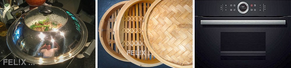 · Wok oder Pfanne mit Dämpfeinsatz und Deckel, oder Bambuskorb