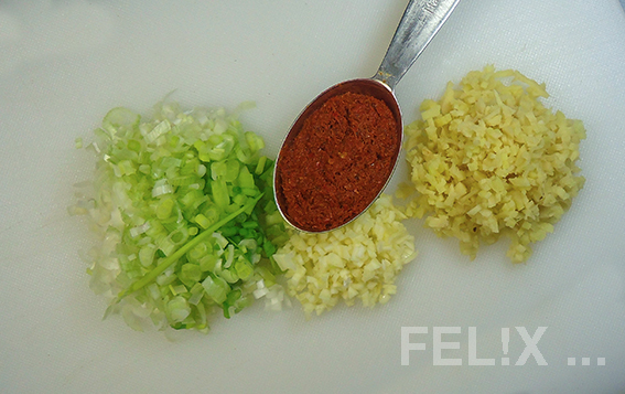Dann nacheinander Ingwer, Frühlingszwiebelchen und schliesslich den Knoblauch dazugeben, alles gut dünsten.