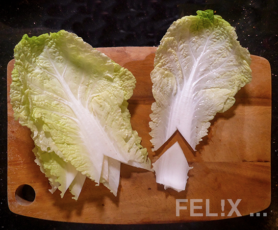 Vom Chinakohl 12 möglichst grosse Blätter lösen, waschen.