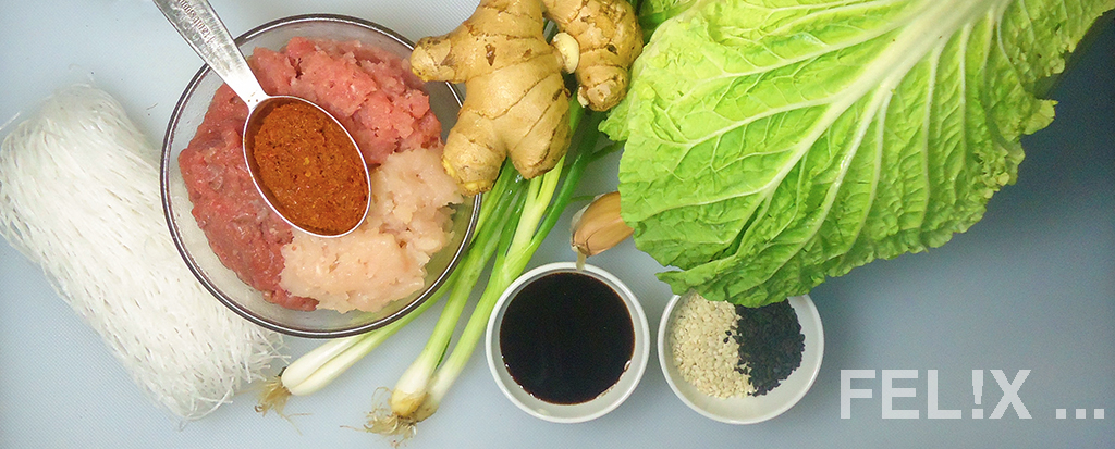 Als Hülle habe ich mich mal für Chinakohl-Blätter entschieden, ausserdem Hackfleisch «Dreierlei» (Rind, Schwein und Huhn) verwendet.