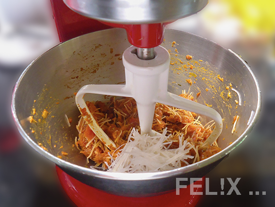 Hackfleisch mit der Würze und den Glasnudeln gut mischen (= ca. 450 g).