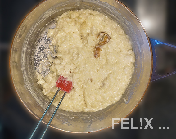 dazugeben, offen auf kleinstem Feuer sanft köcheln lassen, ab und zu umrühren, damit nichts ansetzt, bis ein dicker Reisbrei entsteht, der sich beim Umrühren vom Pfannen­boden löst.