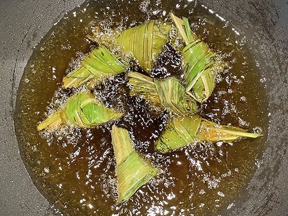 Pandanus-Päckchen portionenweise 5–6 Minuten frittieren, auf Haushaltpapier abtropfen.