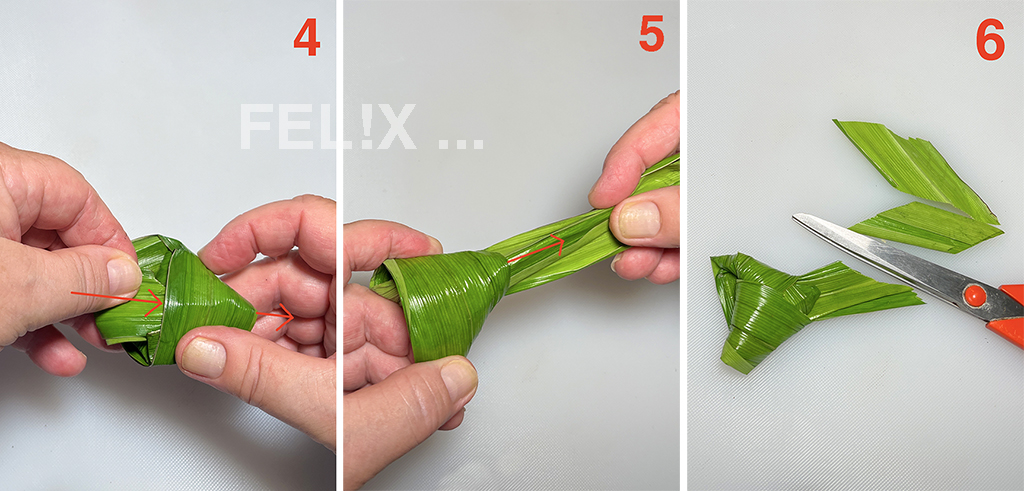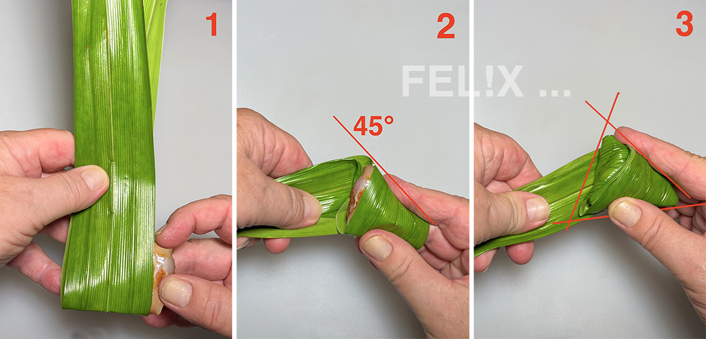 Das abstehende, doppelte Blatt in einem 45° Winkel dreieckförmig 3mal um das Fleischstück falten (2 und 3).