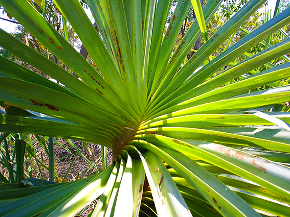Die schmalen, schwertförmigen Blätter des Schraubenbaums (Pandanus odoratissimus) werden als zarte Würze entweder verknotet oder in 3 cm lange Stücke geschnitten und in Saucen, Currys oder Reis mitgekocht.