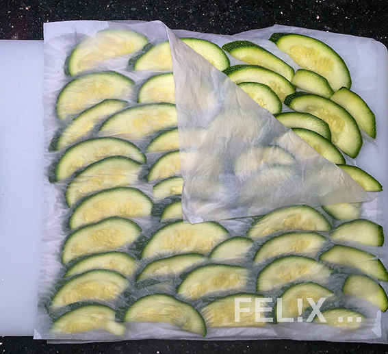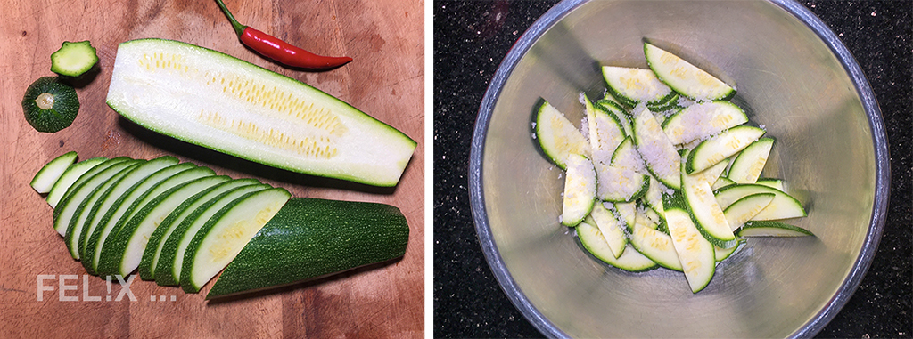 - Das Salzen entzieht den Zucchini-Scheibchen Wasser, welches sie sonst beim Erhitzen abgeben.
