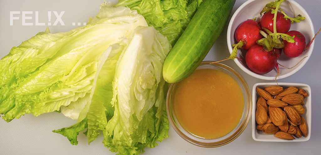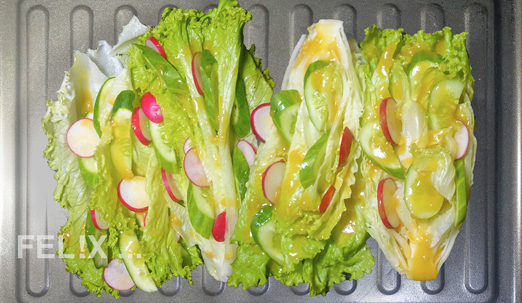 Radieschen und Gurke in Scheiben schneiden, letztere allenfalls halbieren. Zwischen die Blätter der Herzen stecken.