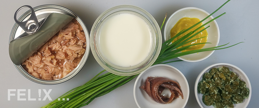 Thunfisch (75 g) samt der Lake (ca. 25 g), Sardellen, abgetropften Kapern, Frischkäse, Senf und den Schnittlauchröllchen fein pürieren (siehe auch Tipp).