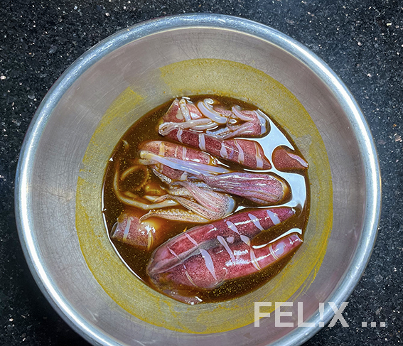 alles mischen, die Kalmare darin marinieren.