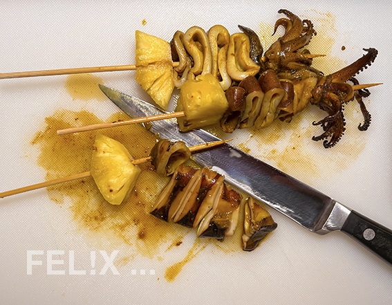 Kalmar-Spiesschen rundum auf mittlerer Glut nur kurz grillen: sie brauchen lediglich ein paar Minuten, sonst werden sie zäh.