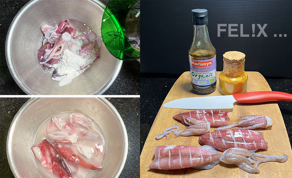 Salz, Mehl und Wasser zu den vorbereiteten Kalmaren geben, gut mischen. Darin etwa 15 Minuten belassen.