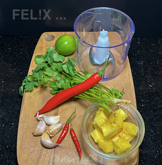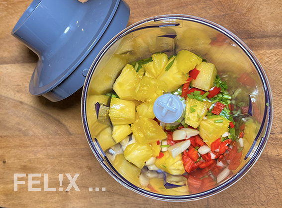 Alles samt den restlichen ca. 75 g Ananas und dem Limettensaft in einem kleinen Cutter oder in der Kräutermühle fein pürieren.