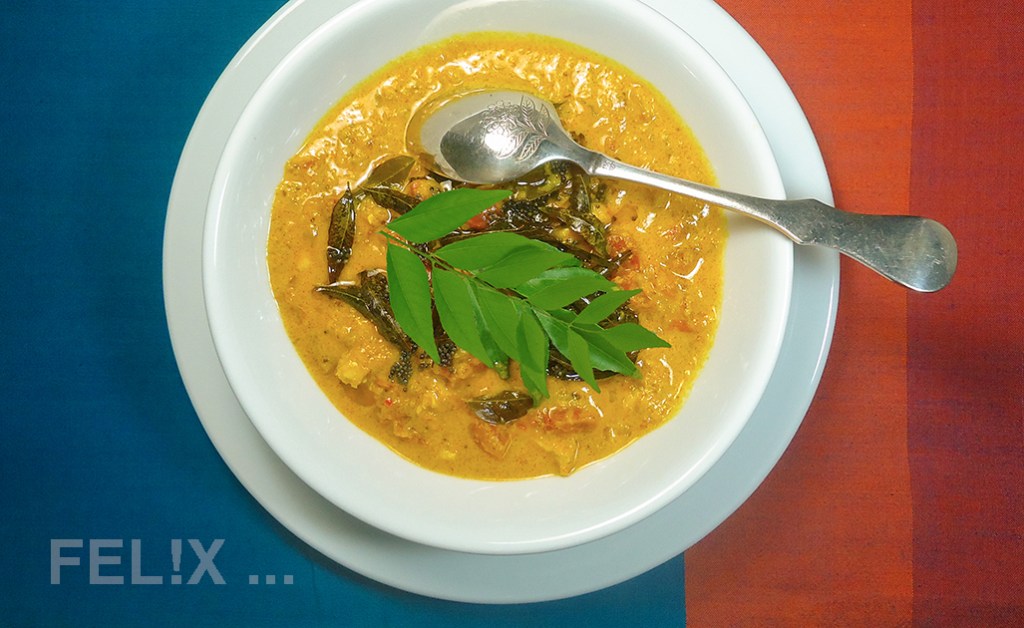 Südindische Currys zeichnen sich durch die Verwendung von Kokosnuss, schwarzen Senfkörnern und Curry-Blättern aus – selbstverständlich begleitet von einer sehr aromatischen Curry-Paste.
