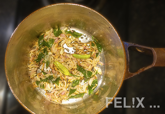 Schalotten-Streifen, Curry-Blätter und Chili dazugeben, unter Wenden braten, bis alles beginnt, leicht Farbe anzunehmen.