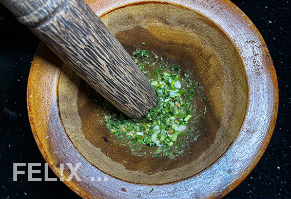 Stiele fein hacken, samt Knoblauch und Salz im Mörser zerstossen.