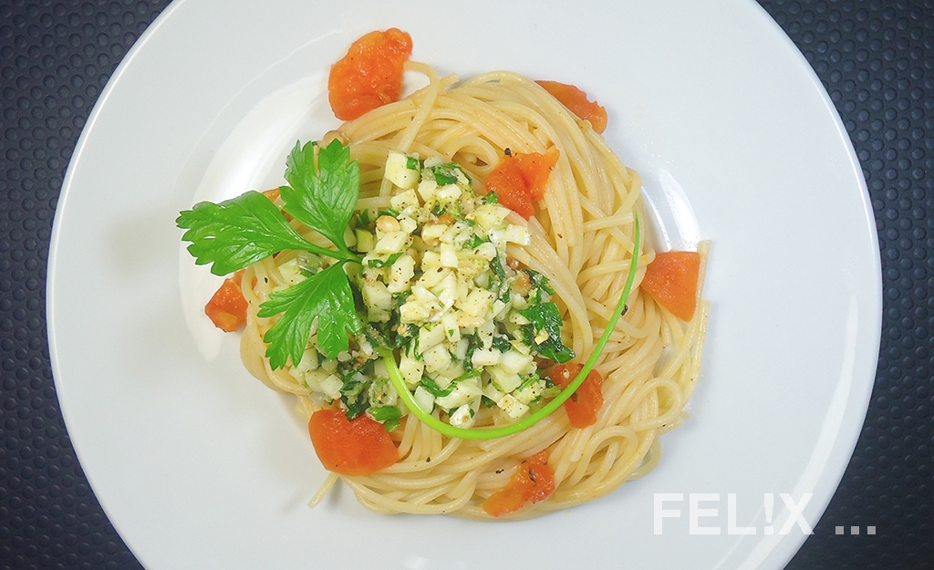 PASTA MIT TOMATEN UND TRITO AUS PETERSILIE UND MOZZARELLA
