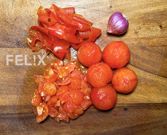 Das ist natürlich völliger Unsinn, denn Schalen und eben auch der beim Schälen entstandene Saft gehören in einer Box im TK gesammelt, um später mit weiteren Gemüseabschnitten zu einer Tomatenessenz oder Gemüsebouillon gekocht zu werden!