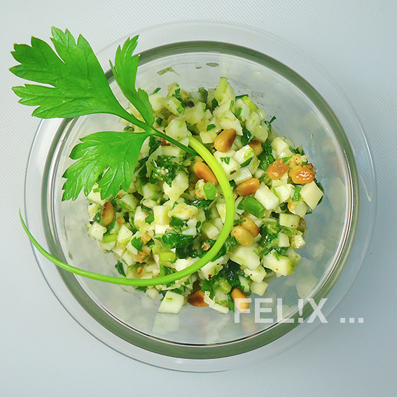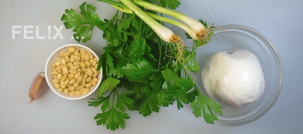 Ich habe dafür Petersilie, Pinienkerne und – ha! – Mozzarella di bufala verwendet.