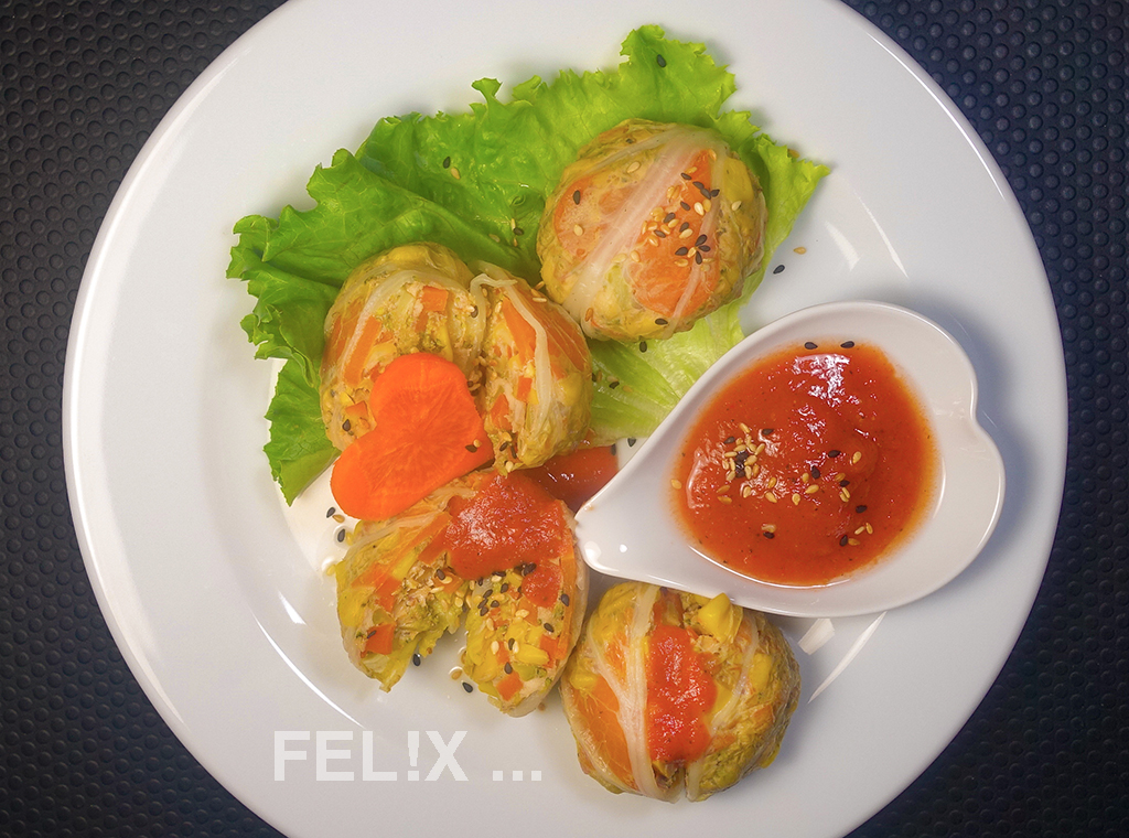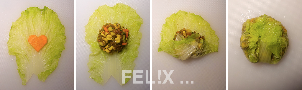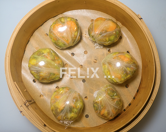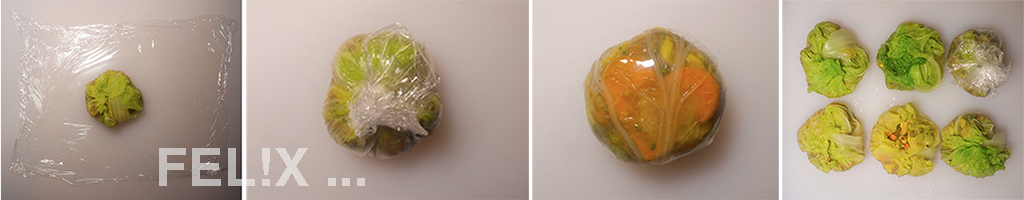 In Chinakohlblätter verpackt und mittels Klarsichtfolie zu Kugeln gedreht, werden diese im Dampf gegart.