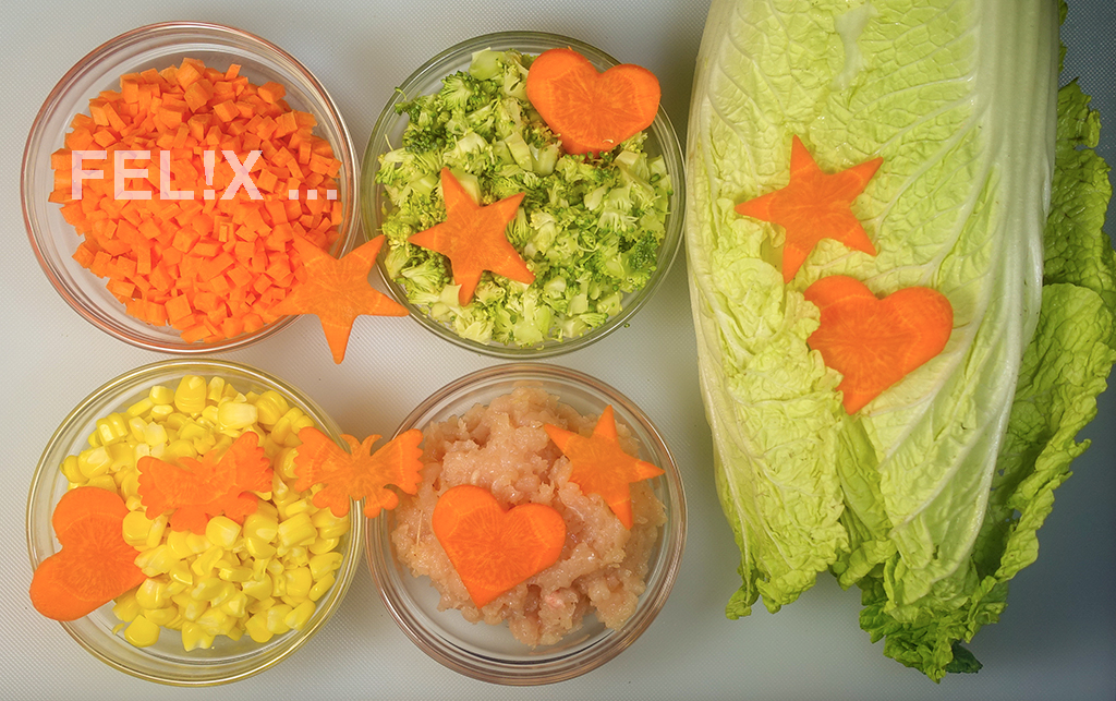 Karotten werden klein gewürfelt, Broccoli gehackt, Maiskörner runden das Ganze ab und etwas Hackfleisch vom Hähnchen liefert die Bindung.
