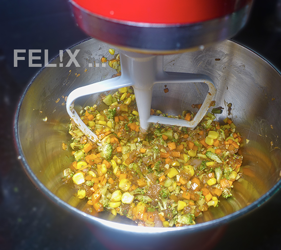 Gemüse samt Fleisch in eine Schüssel geben, würzen, gut mischen: entweder mit den Fingern oder mit dem Flachrührer (= ca. 500 g).