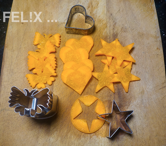 Vom dicken Ende der Karotte 12 dünne Scheiben hobeln. Aus diesen kleine Motive ausstechen (Herzen, Schmetterlinge, Sterne, usw.). Beiseitestellen.
