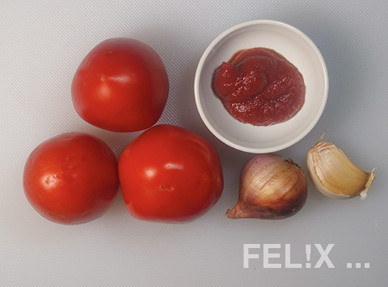 Tomaten grob würfeln, Schalotte und Knoblauch hacken, samt Tomatenpüree, S&P fein pürieren.