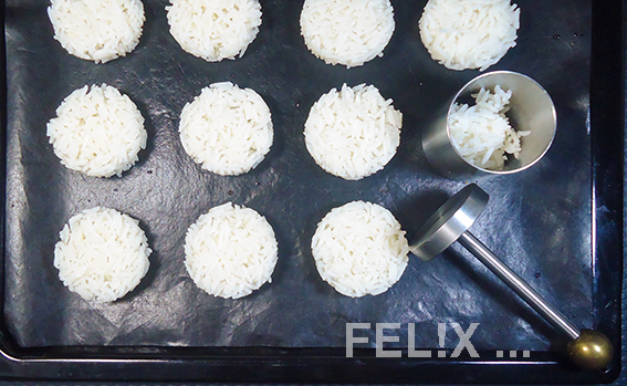 2Auf einem mit Backfolie/-papier belegten Blech mit dem Metallring ca. 20 flache Reistaler zu je 20 g formen.