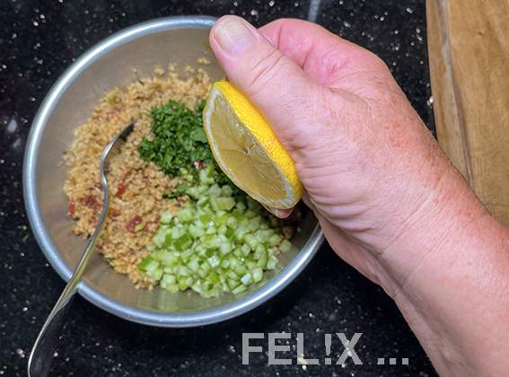 Zitrone auspressen, alles samt Olivenöl mit der restlichen Bulgur-Mischung zu einem Taboulé mischen!